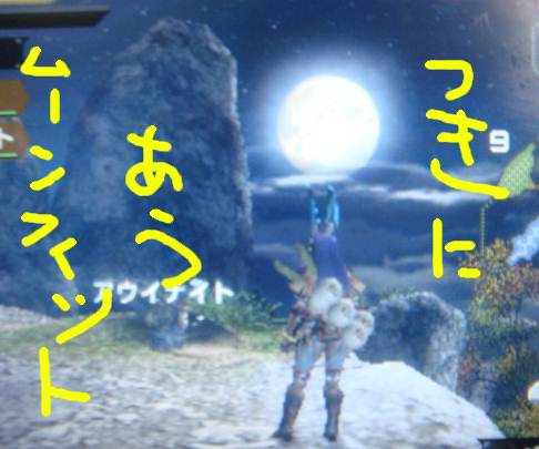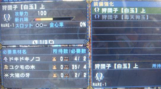 やだ、何コレ・・・ウサギちっくボーン装備と合いそうじゃない。 攻撃力度外しして作っちゃったよ! ムーンフィーット 狩りまくったらやっぱり研摩しないといけないんだぜ。 砥げてるのかこれー?なモーションがラブリィ。 双剣白玉上を作るにはドスファンゴの素材がいるらしい。 なので、村★★の5 ざわめく森 へ 行って来ましたー! でかいけど、びっくりする程でかくはない。 リンクするファンゴの突進が超邪魔だったくらいかな~。 背後取りたいのに方向展開が機敏すぎ>< 何回転がって逃げた事か・・・。 華麗なる団子しばきでファンゴ倒して、さあ剥ごう!って〇ボタン押そうとしたら 乱入クエ来たー(゜Д゜) ー! エリアにモンス湧いたとかなんとか。 熊でもでるのかな~って一周してしたら おおおおおニューゲームのOPにでてた電気ビリビリの獣がいるじゃないかっ。 ひよっこに対面させちゃうわけ? 団子でジンオウガと戦えと? 村に帰るー。 いつか料理してやるからなあああああ。