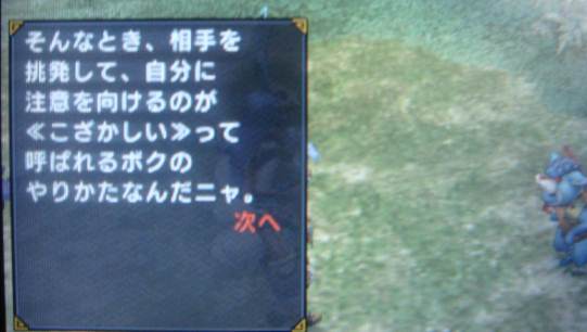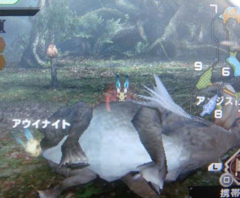 青熊獣ってまたおまえか。リベンジせずに、緊急やれば良かったやーん。 緊急を進める前にオトモをもうちょい鍛えておこうと低Lv狩りに勤しんでました。 ケルビの角納品とか。 しゃがむとオトモも一緒に歩腹前進するから超可愛い(* ´Д`*)=3 無意味に歩腹前進させたまま納品。を繰り返し スキルポイントが70になったのでっ、回復の笛を習得させましたー! 回復薬を山盛り持っていざ熊狩りへっ! 武器は双剣です。 オトモを巻き込みにくくて使いやすいんだな~。 鬼人化中は×ボタンで回避できないんですね。 なんどか熊にボコられたし(`Д´) 熊戦は3回目なので突進パターンも分かって回避しやすくなった~。 でも自分に必死でオトモがどうなってるかは全く分からなかった! 自作のペイントボールつけて熊叩き。 エリアして回復&研磨したら戻って足元切りつけて~ わりかし早い段階で討伐できたー! 倒した瞬間ってものすごくスッキリ~しますね! ジャギイにどつかれようとも蚊みたいなもんよε('∞'*) はぎ取後報酬をみたら・・・・オトモがちゃっかり熊の毛ゲットしてました・・・・。 ケツ向けて、もそもそしてたのは拾ってたんかーい。 戻ったら、オトモのなつき度もアップしてたのが嬉しい~。 緊急クエ後の村は 新しい武器が買えたり、会話が多数発生してたりと 楽しいですねー! 次は村★★ですね! 倒したいような恐いような。つか恐い。