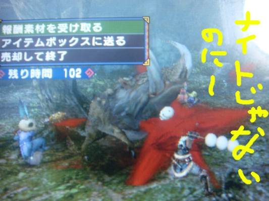武器は双剣でっす。 使いたてで不慣れな弓を使うのは止めときました(・_・; 空飛ぶ系でしょー? 無事倒せるか不安なまま渓谷へ。 ・・・・ におい玉とモンス混戦殴り愛の試合でした(゜Д゜) もうねえ ドスファンゴ超邪魔 クルペッコ お前は 歌うなああああああ。 喉膨らませて反復横飛びな挑発されると (`Д´) きいいいいいいいいいってなるわああああああああああ。 エリア逃げ2・3された辺りから、 ドスファンゴ来た? におい玉くらいやがれええええ! 私はメイン狩りに忙しいのっ(`Д´) オトモの笛に助けられたり 燃える唾をくらってゴロゴロ転がったり 突付きまくられたり 武器がはじかれまくったり と・・・・かなりグダグダな展開&ごり押しで討伐完了~┐( ̄ヘ ̄)┌ フゥゥ~ 鬼人化を効率よく生かせたら、戦闘時間半分削れた気がするなあ。 PR
