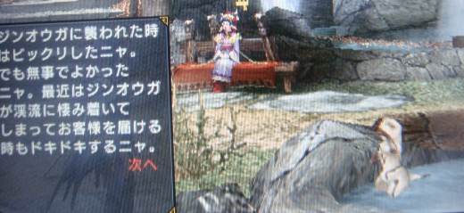 雪国のウルクススの登場シーンはワロタ。 ごっつうワイルドなウサギでした。 敵も色々豊富になって来て狩るのも楽しく さっくりクエクリアー。 残るは緊急クエ! 初のちゃんとしたドラゴンですよー(`0´)ノ 帰宅途中の電車内で「うっ」とかいいながら戦闘。 尻尾の攻撃がいやらしいですね>< 懐にもぐりこんで切りかかるけど 飛ぶし アングルがグルグル回ってやりにく~。 殴られてピヨった所に一撃受けて1落ちorz わし掴みを避けて 相手のターン 自分のターン で 切りマクって終了! 素材色々でほっくほくです。 戻ったら、OPで村まで送ってくれた猫に遭遇! 予想外の再開は嬉しいですね! 農場も新たにトロッコが登場~。 採掘場所も増えて楽しいです。 ・・・ 本日 勤務先のエリアを迂回して、こっそりローソンで・・・・ アイルーを買ってきましたー! 誰も買ってないから選び放題(´▽`) b 1個500円です。。゛(ノ><)ノ 3個購入。 結果 ↓ レイア猫 レウス猫 ユクモノ猫 でしたー。 ユクモ欲しかったから嬉しい。 どんぐりも欲しかったんだけどなあ。